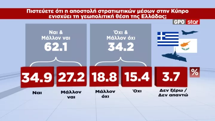 Το 62,1% των ερωτηθέντων απαντά «ναι και μάλλον ναι» στο εάν η αποστολή στρατιωτικών μέσων στην Κύπρο ενισχύει τη γεωπολιτική θέση της Ελλάδας.