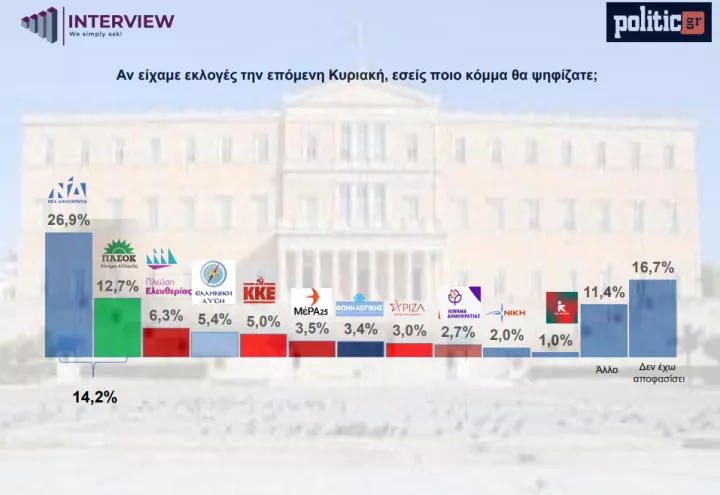 Η Νέα Δημοκρατία ενισχύει το προβάδισμά της στην εκτίμηση ψήφου (32,3%), έχοντας διαφορά 17 μονάδων από το δεύτερο ΠΑΣΟΚ (15,2%) στη δημοσκόπηση της Interview για λογαριασμό του politic.gr.