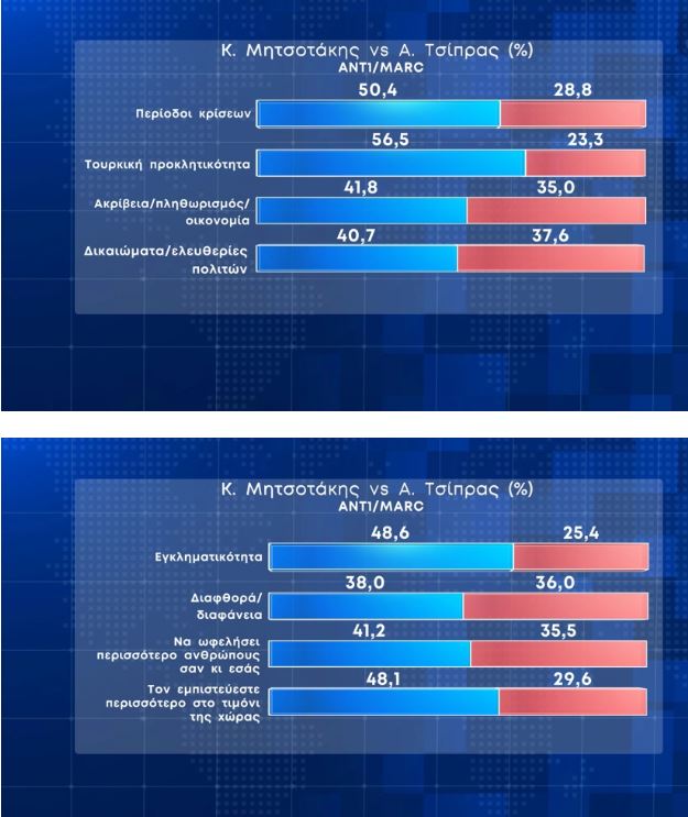 Η δημοσκόπηση παρουσιάζει και ένα crash test μεταξύ του Κυριάκου Μητσοτάκη με τον Αλέξη Τσίπρα σε διάφορους τομείς αναδεικνύοντας τον νυν πρωθυπουργό «νικητή» σε κάθε κατηγορία.