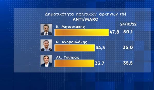 Ειδικότερα ο κ. Μητσοτάκης συγκεντρώνει 50,1%, ο Νίκος Ανδρουλάκης 34,3% και ακολουθεί ο Αλέξης Τσίπρας.