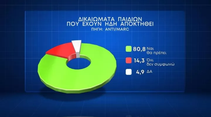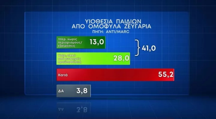 Στο θέμα της τεκνοθεσίας από τα ομόφυλα ζευγάρια, κατά τάσσεται το 55,2%, ενώ υπέρ το 41% (υπέρ χωρίς περιορισμούς/εξαιρέσεις 13%, υπέρ αλλά υπό αυστηρές προϋποθέσεις 28%).