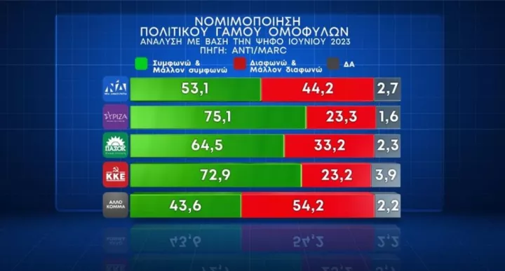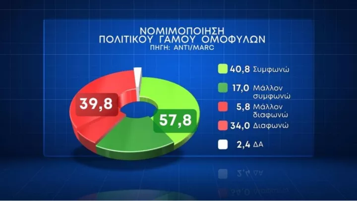 «Ναι» στον γάμο των ομόφυλων ζευγαριών λέει το 57,8% των πολιτών, σύμφωνα με τη δημοσκόπηση της Marc που παρουσιάστηκε στο κεντρικό δελτίο ειδήσεων του ΑΝΤ1 το βράδυ της Τετάρτης. Ωστόσο, η πλειονότητα των πολιτών εμφανίζεται αρνητική (55,2%) στην τεκνοθεσία από ομόφυλα ζευγάρια. Υπέρ της μεταρρύθμισης της επιστολικής ψήφου τάσσεται το 74,2% των πολιτών, ενώ αμετάβλητο παραμένει το πολιτικό σκηνικό με προβάδισμα 21 μονάδων της ΝΔ έναντι του ΠΑΣΟΚ και τον ΣΥΡΙΖΑ να εξακολουθεί να βρίσκεται στην τρίτη θέση.