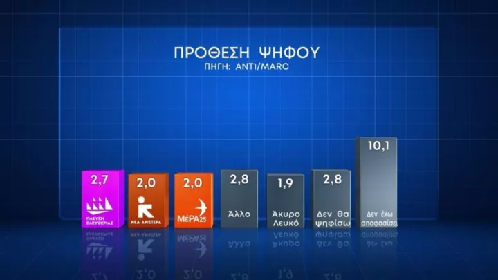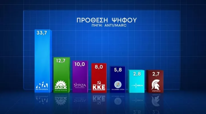 Αναλυτικά, η ΝΔ συγκεντρώνει 33,7%, το ΠΑΣΟΚ 12,7%, ο ΣΥΡΙΖΑ 10%, το ΚΚΕ 8%, η Ελληνική Λύση 5,8%, η Νίκη 2,8%, οι Σπαρτιάτες 2,7%, η Πλεύση Ελευθερίας 2,7%, η Νέα Αριστερά 2% και το ΜέΡΑ25 με 2%.