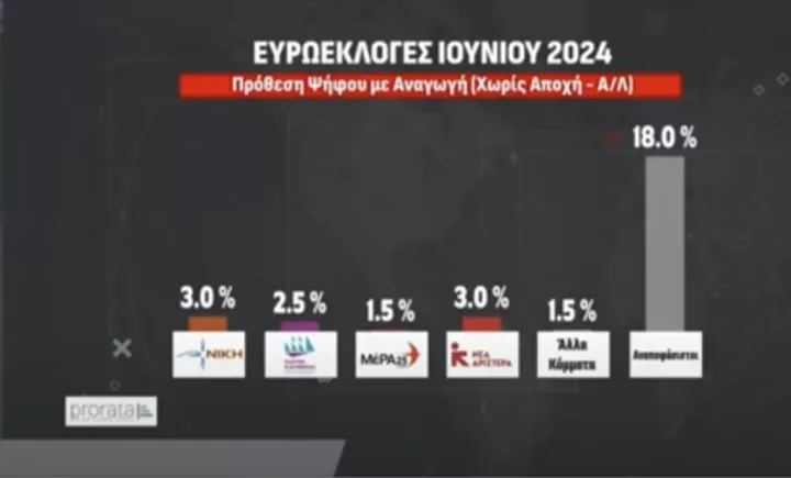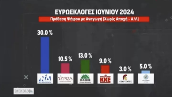 Πιο αναλυτικά, σύμφωνα με τη δημοσκόπηση, στην πρόθεση ψήφου με αναγωγή επί των εγκύρων, για τις ευρωεκλογές, η ΝΔ προηγείται με 30%, δεύτερο είναι το ΠΑΣΟΚ-ΚΙΝΑΛ με 13% και τρίτος ο ΣΥΡΙΖΑ με 10,5%.