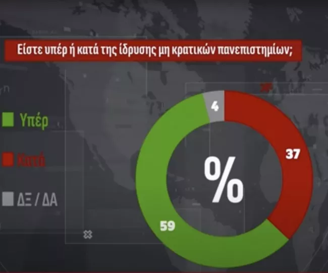 Κατά την έρευνα, το 59% των ερωτηθέντων δηλώνει ότι τάσσεται υπέρ της ίδρυσης μη κρατικών πανεπιστημίων, ενώ αρνητικό εμφανίζεται το 37%.