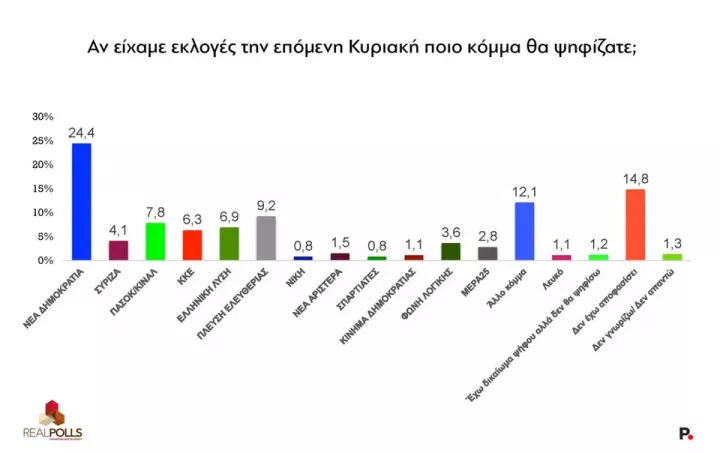 Στην πρόθεση ψήφου, η ΝΔ συγκεντρώνει 24,4%, ο ΣΥΡΙΖΑ 4,1%, το ΠΑΣΟΚ 7,8%, το ΚΚΕ 6,3%, η Ελληνική Λύση 6,9%, η Πλεύση Ελευθερίας 9,2%, η Φωνή Λογικής 3,6%, το ΜέΡΑ25 2,8%, άλλο κόμμα απαντά το 12,1%, ενώ οι αναποφάσιστοι φτάνουν στο 14,8%.