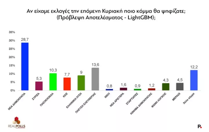 Το κυβερνών κόμμα λαμβάνει 28,75% στην πρόβλεψη ψήφου (28,31% στις ευρωεκλογές του 2024) ενώ στη δεύτερη θέση καταγράφεται η Πλεύση Ελευθερίας με 13,6%.