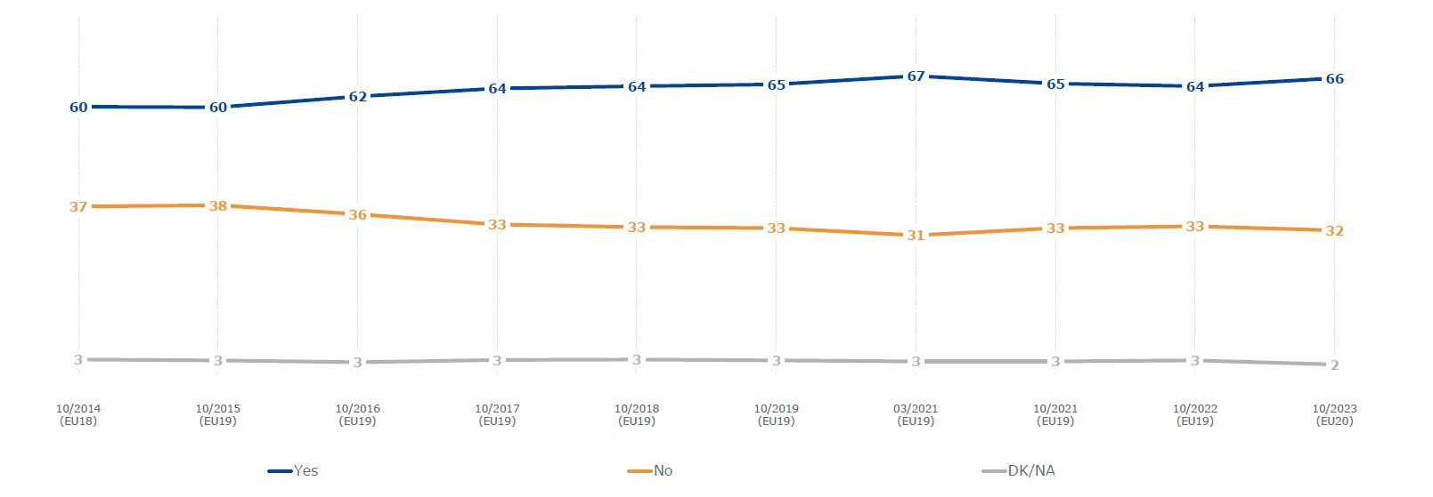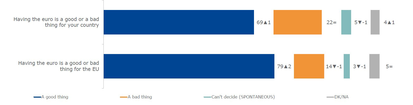 Σύμφωνα με την τελευταία έρευνα του Ευρωβαρόμετρου της Ευρωπαϊκής Επιτροπής, περίπου 8 στους 10 Ευρωπαίους στηρίζουν το κοινό μας νόμισμα. Συγκεκριμένα, τα αποτελέσματα της έρευνας δείχνουν ότι το 79% όσων απάντησαν πιστεύει ότι το ευρώ είναι καλό για την ΕΕ και το 69% πιστεύει ότι είναι καλό για τη χώρα τους.