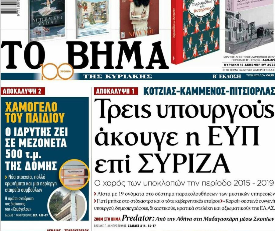 «Ο χορός των υποκλοπών την περίοδο 2015-2019», επισημαίνεται στο πρωτοσέλιδο της εφημερίδας, όπου αναφέρεται χαρακτηριστικά: «Λίστα με 19 ονόματα στο σύστημα παρακολουθήσεων των μυστικών υπηρεσιών. Γιατί μπήκε στο στόχαστρο ο τότε κυβερνητικός εταίρος. Κοριοί σε στενό συγγενή υπουργού, δημοσιογράφους, δικαστικούς, κρατικά στελέχη και αξιωματικούς της ΕΛΑΣ».