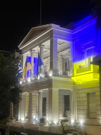 Το Υπουργείο Εξωτερικών στο Σύνταγμα, φωταγωγημένο με τα χρώματα της Ουκρανίας (24/2//2026)