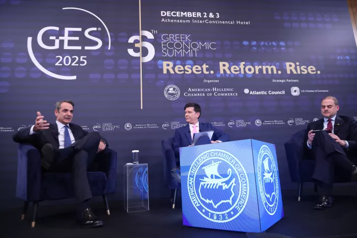 Ο πρωθυπουργός Κυριάκος Μητσοτάκης συζητάει με τον πρόεδρο του Ελληνοαμερικανικού Εμπορικού Επιμελητηρίου, Γιάννη Σαρακάκη, στο πλαίσιο του 36ου Greek Economic Summit, που διοργανώνει το Επιμελητήριο.
