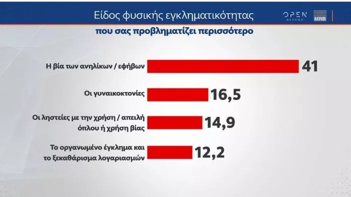 Πρώτη εγκληματική δραστηριότητα που απασχολεί τους πολίτες είναι η βία ανηλίκων (ποσοστό 41%). Ακολουθούν οι γυναικοκτονίες (16,5%), οι ληστείες και το οργανωμένο έγκλημα.