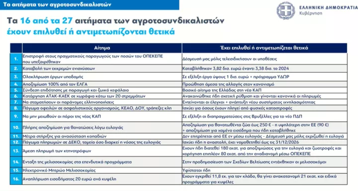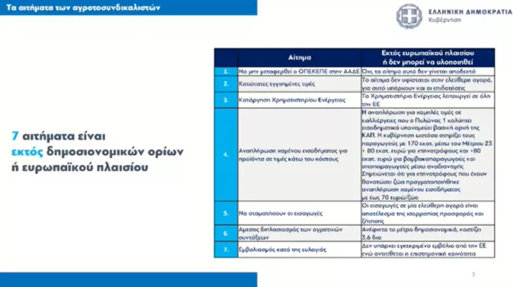 Στο σημείο αυτό διευκρίνισε ότι επτά από τα αγροτικά αιτήματα είναι εκτός δημοσιονομικού και ευρωπαϊκού πλαισίου, όπως η κατάργηση του Χρηματιστηρίου Ενέργειας, καθώς αποτελεί υποχρέωση σε όλες τις χώρες της ΕΕ. «Οι πολίτες πρέπει να ξέρουν τι ζητάνε οι αγρότες και τι απάντησε η κυβέρνηση», είπε και πρόσθεσε: Δεν είναι εφικτό να μην υπαχθεί ο ΟΠΕΚΕΠΕ στην ΑΑΔΕ, όπως να υπάρξουν κατώτερες εγγυημένες τιμές, διότι δεν υπάρχουν τέτοια συστήματα στην Ευρώπη, υπάρχουν επιδοτήσεις.