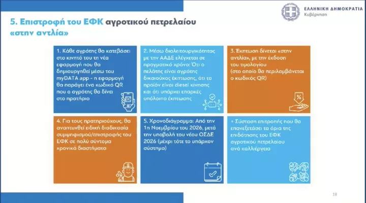 Για τους πρατηριούχους, θα αναπτυχθεί ειδική διαδικασία συμψηφισμού/επιστροφής του ΕΦΚ σε πολύ σύντομα χρονικά διαστήματα. - Χρονοδιάγραμμα: Από την 1η Νοεμβρίου του 2026, μετά την υποβολή του νέου ΟΣΔΕ 2026 (μέχρι τότε το υπάρχον σύστημα).