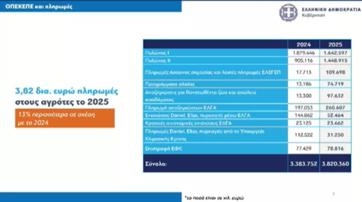 Στην αρχή της ομιλία του ο αντιπρόεδρος της κυβέρνησης Κωστής Χατζηδάκης επισήμανε, ότι το αγροτικό ζήτημα βρίσκεται στο επίκεντρο και σημείωσε πως η κυβέρνηση και η ΝΔ έχουν αναλάβει τις ευθύνες τους στον ΟΠΕΚΕΠΕ, σε αντίθεση με τα άλλα κόμματα, για να υπογραμμίσει εν συνεχεία ότι οι πληρωμές προς τους αγρότες το 2025 φτάνουν τα 3,82 δισ. ευρώ, 13% περισσότερα από το 2024, όπως τόνισε.
