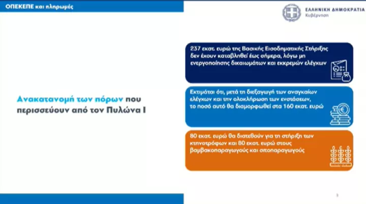 Αναδιανομή αδιάθετων πόρων της βασικής ενίσχυσης: Οι πόροι που θα μείνουν αδιάθετοι από τη βασική ενίσχυση θα διανεμηθούν στους αγρότες. Δεν θα επιστρέψουν στις Βρυξέλλες. Από τη βασική ενίσχυση θα περισσέψουν περίπου 160 εκατ. ευρώ.