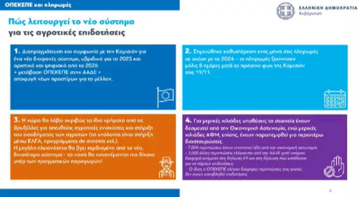 Πρόσθεσε δε ότι «πρέπει να υπογραμμίσουμε πως με το νέο σύστημα οι παραγωγοί θα βγουν κερδισμένοι καθώς τα κονδύλια από την Κομισιόν θα κατανέμονται με δικαιότερο τρόπο» και γνωστοποίησε ότι «έχουμε 7.004 περιπτώσεις που έχουν αποκαλυφθεί από την Οικονομική αστυνομία και άλλες 3.000 που ελέγχονται από την ΑΑΔΕ, ενώ ελέγχους κάνει και ο ΟΠΕΚΕΠΕ».