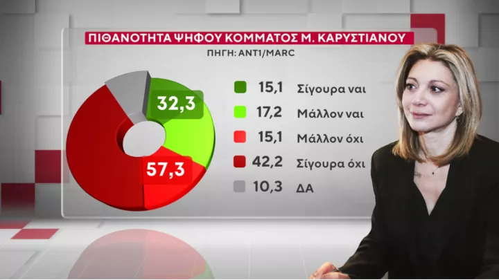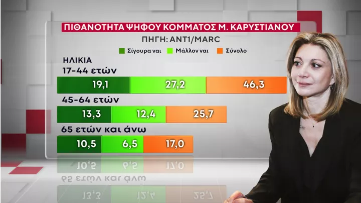 Όσον αφορά την πιθανότητα δημιουργίας κόμματος από τη Μαρία Καρυστιανού, το 15,1% δηλώνει ότι σίγουρα θα ψήφιζε ένα τέτοιο κόμμα, ενώ ο χώρος ευρύτερης επιρροής φτάνει το 17,2% φτάνοντας έτσι στο 32,3% τη δυνητική επιρροή μίας τέτοιας κίνησης. Το κοινό της κας Καρυστιανού αποτελούν κατά πλειοψηφία γυναίκες, αλλά και οι νεότερες γενιές - είναι χαρακτηριστικό ότι η δυνητική ψήφος (σίγουρα ναι και μάλλον ναι) φτάνει στο 46,3% και πέφτει στο 17% στις ηλικίες από 65 ετών και άνω. Μάλιστα, διεισδύει τόσο στην Ελληνική Λύση - η επιρροή της φτάνει το 47,6%, όσο και στον ΣΥΡΙΖΑ (36,2%), όπως και στο ΠΑΣΟΚ (35,3%) αλλά και στη ΝΔ (10,1%).