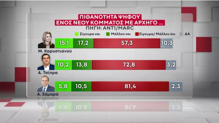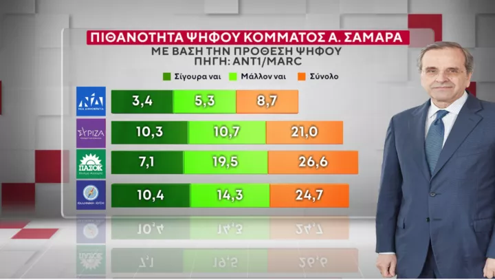 Για τον Αντώνη Σαμαρά, η δυναμική φτάνει στο 16,3%, αλλά μόλις το 5,8% δηλώνει ότι θα ψήφιζε σίγουρα τον πρώην πρωθυπουργό χαμηλό. Σύμφωνα με τα αποτελέσματα της έρευνας, ένα κόμμα Σαμαρά επηρεάζει το 26,6% του ΠΑΣΟΚ, ένα 24,.7% της Ελληνικής Λύσης, ένα 21% του ΣΥΡΙΖΑ και ένα 8,7% εκείνων που προτίθενται να ψηφίζουν ΝΔ. Ο πρώην πρωθυπουργός έχει κοινό (11,6%) στην Πλεύση Ελευθερίας, αλλά «περνάει» θετικά (18,7) σε εκείνους που επιλέγουν εξωκοινοβουλευτικά κόμματα, όπως και στους αναποφάσιστους (18%).