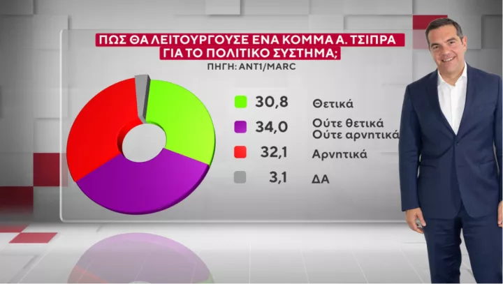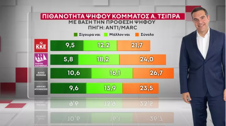 Η συνολική πιθανότητα ψήφου για ένα κόμμα Τσίπρα έφτασε στο 24%, με το 10,2% να δηλώνει «σίγουρα ναι» και το 13,8% «μάλλον ναι». Η συνολική πιθανότητα ψήφου μεταξύ εκείνων που δηλώνουν σήμερα ψηφοφόροι του ΣΥΡΙΖΑ φτάνει στο 91,3%, των ψηφοφόρων του ΠΑΣΟΚ φτάνει το 23,8% της Πλεύσης Ελευθερίας στο 24% και της Ελληνικής Λύσης το 23,2%. Σημειώνεται ότι ο Αλέξης Τσίπρας επιλέγεται για την πρωθυπουργία από έναν στους τρεις ψηφοφόρους του ΚΚΕ.