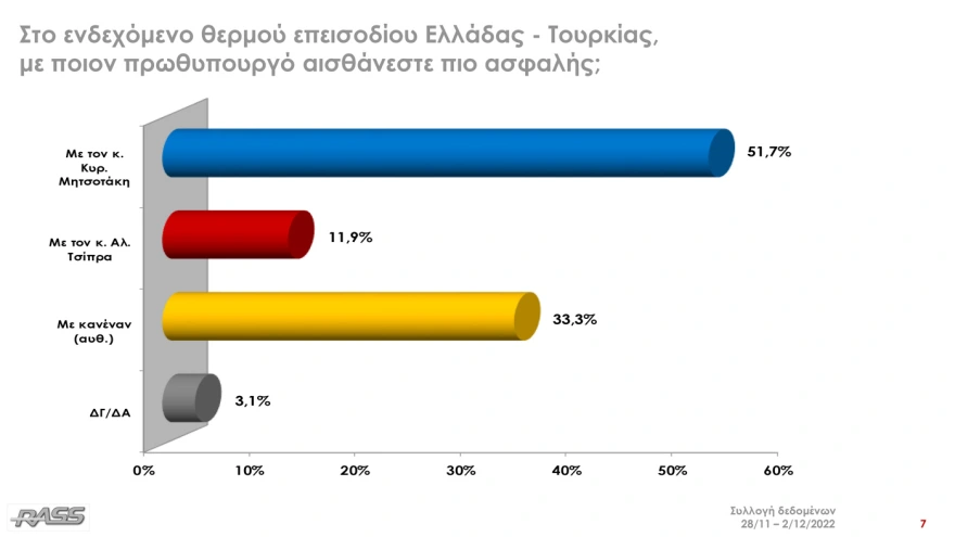 «Στο μέτρο που πρέπει» εκτιμούν σχεδόν οι μισοί πολίτες (48,6%) ότι είναι η πολιτική της κυβέρνησης στα ελληνοτουρκικά θέματα, ενώ στο ενδεχόμενο ενός θερμού επεισοδίου με την Τουρκία δηλώνουν πως αισθάνονται πιο ασφαλείς με πρωθυπουργό τον κ. Κ. Μητσοτάκη (51,7%).