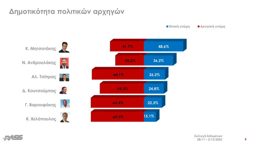 Όσον αφορά το θετικό ισοζύγιο δημοτικότητας, σε αυτό στην κορυφή βρίσκεται ο Κυριάκος Μητσοτάκης, ενώ ακολουθεί ο Νίκος Ανδρουλάκης.