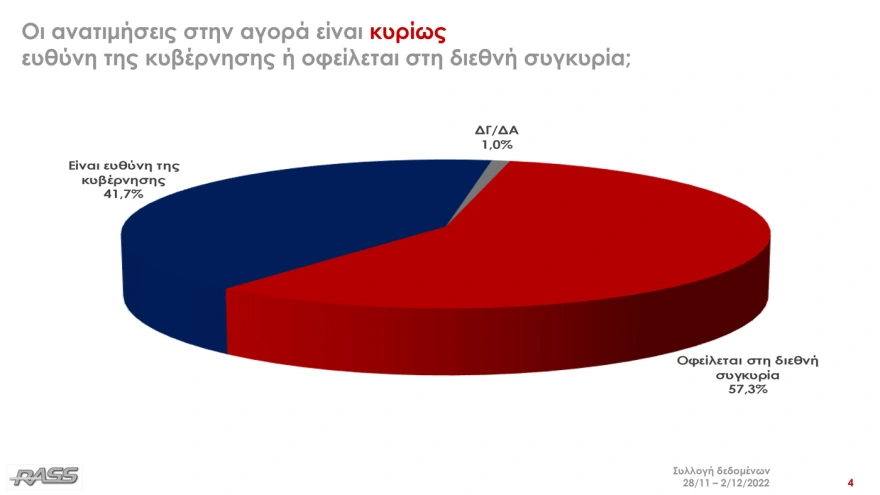 Σημειώνεται ότι έντονη είναι η ανησυχία των ψηφοφόρων για το οικονομικό τους μέλλον (79,3%). Ωστόσο, όπως σημειώνουν τα στελέχη της RASS, «παρά το γεγονός ότι τους απασχολεί η ακρίβεια, θεωρούν ότι οι ανατιμήσεις στην αγορά είναι πρωτίστως απότοκο της διεθνούς συγκυρίας (57,3%) και δευτερεύοντος ευθύνη της κυβέρνησης (41,7%), ενώ οι επτά στους δέκα δεν πιστεύουν ότι το καλάθι του νοικοκυριού σε αυτή τη φάση έχει αποδώσει.