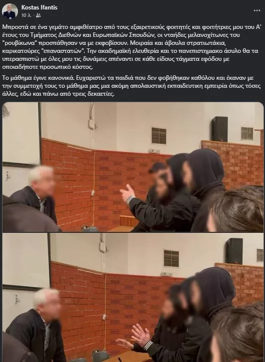 «Μπροστά σε ένα γεμάτο αμφιθέατρο από τους εξαιρετικούς φοιτητές και φοιτήτριες μου του Α' έτους του Τμήματος Διεθνών και Ευρωπαϊκών Σπουδών, οι νταήδες μελανοχίτωνες του "ρουβίκωνα" προσπάθησαν να με εκφοβίσουν. Μοιραία και άβουλα στρατιωτάκια, καρικατούρες "επαναστατών".