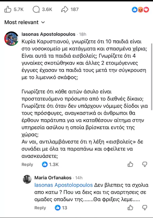 Νωρίτερα, κάτω από την ανάρτηση της Μαρίας Καρυστιανού σχετικά με το πολύνεκρο ναυάγιο μεταναστών στη Χίο, ο Ιάσονας Αποστολόπουλος της ζήτησε να ανασκευάσει την αναφορά της περί «παράνομων εισβολών» αναφέροντας, μεταξύ άλλων: «Γνωρίζετε ότι 10 παιδιά είναι στο νοσοκομείο με κατάγματα και σπασμένα χέρια; Είναι αυτά τα παιδιά εισβολείς;».