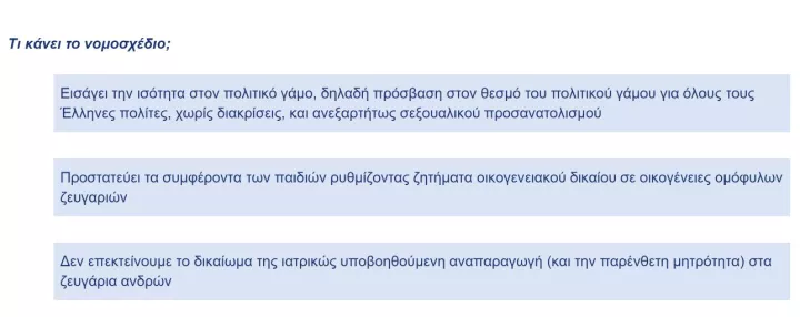 Το προτεινόμενο σχέδιο νόμου θεσμοθετεί στην ελληνική έννομη τάξη τον γάμο μεταξύ δύο προσώπων ανεξάρτητα από το φύλο τους, προκειμένου να επιτευχθούν η ισότητα στον γάμο και η νομική προστασία οικογενειών. Η θεσμοθέτηση της ισότητας στον γάμο δημιουργεί και ισότητα στα δικαιώματα παιδιών ομόφυλων ζευγαριών που ήδη υπάρχουν.