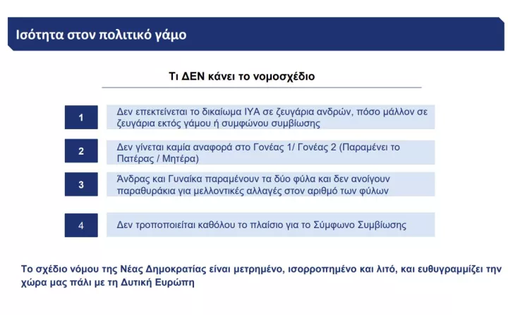 Στον πυρήνα του, το υπό κατάθεση νομοσχέδιο «εισάγει την ισότητα στον πολιτικό γάμο, δηλαδή πρόσβαση στο θεσμό του πολιτικού γάμου για όλους τους Έλληνες πολίτες, χωρίς διακρίσεις, και ανεξαρτήτως σεξουαλικού προσανατολισμού. Προστατεύει τα συμφέροντα των παιδιών ρυθμίζοντας ζητήματα οικογενειακού δικαίου σε οικογένειες ομόφυλων ζευγαριών». Αντιθέτως, «δεν επεκτείνουμε το δικαίωμα της ιατρικώς υποβοηθούμενης αναπαραγωγής (και την παρένθετη μητρότητα) στα ζευγάρια ανδρών», διευκρίνισε εξ αρχής.