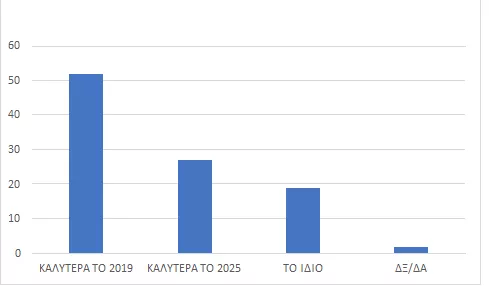 Πράγματι, η Metron Analysis, σε πανελλαδική έρευνα που διενήργησε τον Φεβρουάριο του 2025, διαπίστωσε ότι το 52% των ερωτηθέντων δήλωσε πως είχε μεγαλύτερη οικονομική άνεση το 2019 απ’ οτι το 2025.