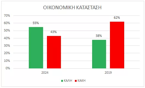 - Το 2025, το 55% των πολιτών αξιολογεί την οικονομική του κατάσταση ως καλή, έναντι 43% που τη θεωρούν κακή.