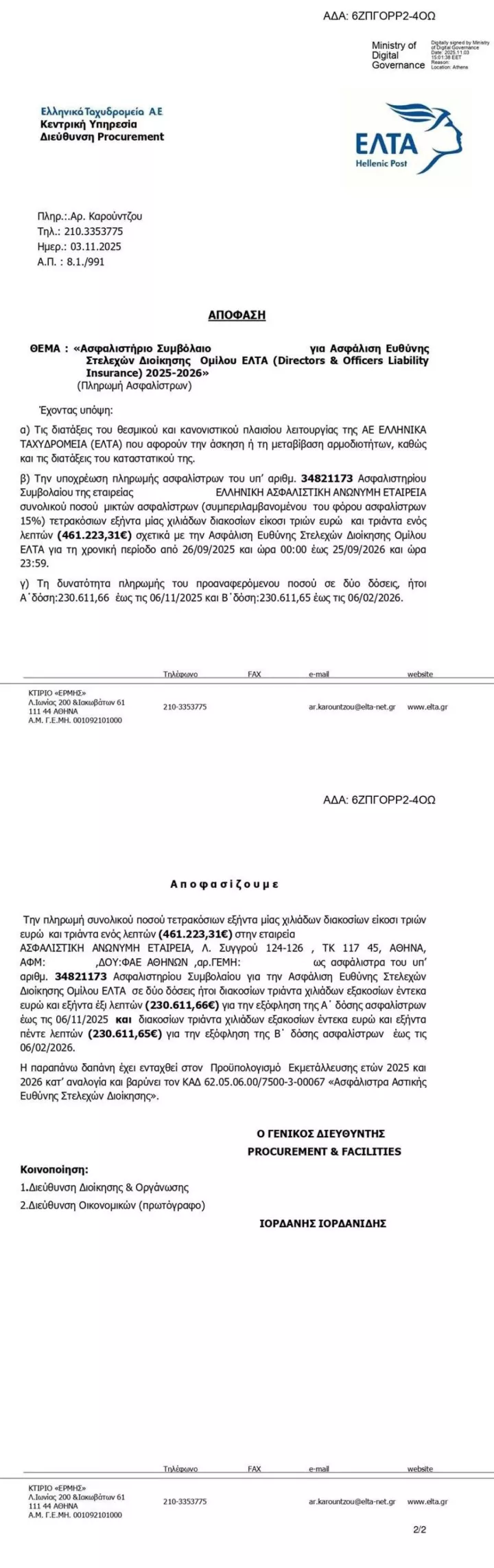 Πρόκειται για ασφάλιση ευθύνης στελεχών διοίκησης ομίλου ΕΛΤΑ για τη χρονική περίοδο από 26/09/2025 και ώρα 00:00 έως 25/09/2026 και ώρα 23:59. Δηλαδή καλύπτει τις τελευταίες 40 κρίσιμες μέρες του Γρηγόρη Σκλύκα στη διοίκηση των ΕΛΤΑ.