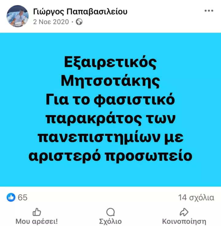 Συγκεκριμένα ο κ. Παπαβασιλείου τον Νοέμβριο του 2020 και με αφορμή περιστατικά βίας σε πανεπιστήμια έγραφε:
