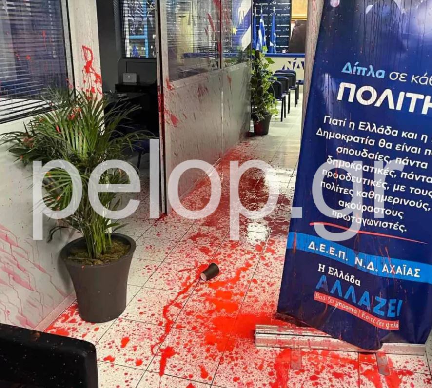 Επίθεση στα γραφεία της διοικούσας επιτροπής εκλογικής περιφέρειας Αχαΐας της ΝΔ, στην Πάτρα, εξαπέλυσαν τέσσερις κουκουλοφόροι.