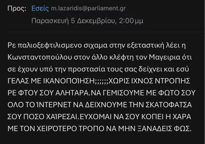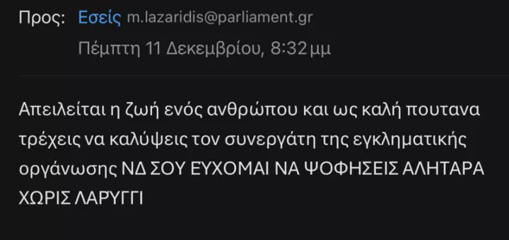 Όλα τα μέλη της Νέας Δημοκρατίας που μετέχουν στην εξεταστική για τον ΟΠΕΚΕΠΕ δέχθηκαν απειλητικά και χυδαία μηνύματα από άγνωστο αποστολέα το βράδυ της Πέμπτης, όπως αποκάλυψε ο Μακάριος Λαζαρίδης.