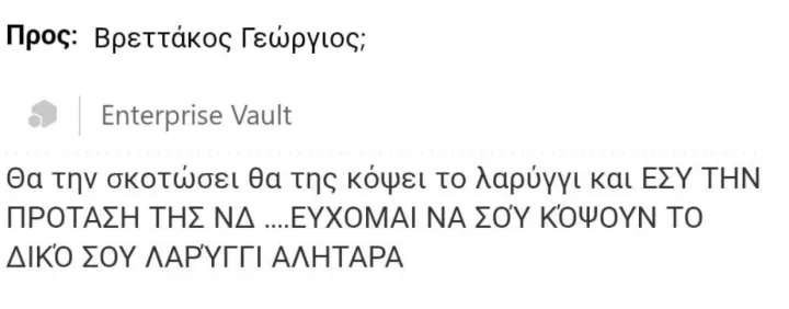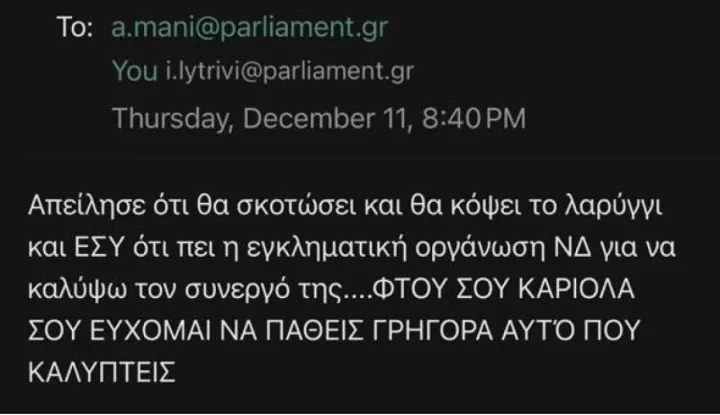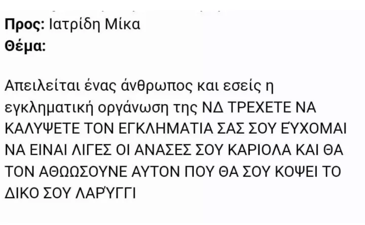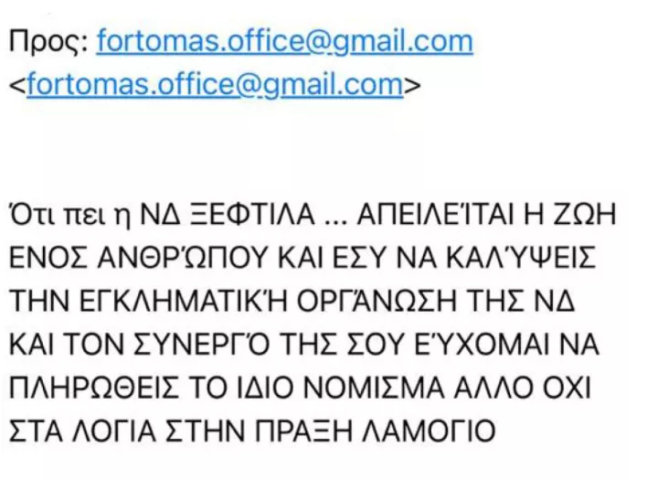 Όπως αναφέρουν πηγές από τη Νέα Δημοκρατία «τα απειλητικά μηνύματα που έχουν αποσταλεί σε βουλευτές της ΝΔ συνιστούν ανοιχτές και ωμές απειλές κατά της ανθρώπινης ζωής, με αναφορές σε δολοφονία και ακρωτηριασμό. Πρόκειται για ακραίες, εγκληματικού χαρακτήρα πρακτικές που δεν έχουν καμία θέση σε μια δημοκρατική χώρα».