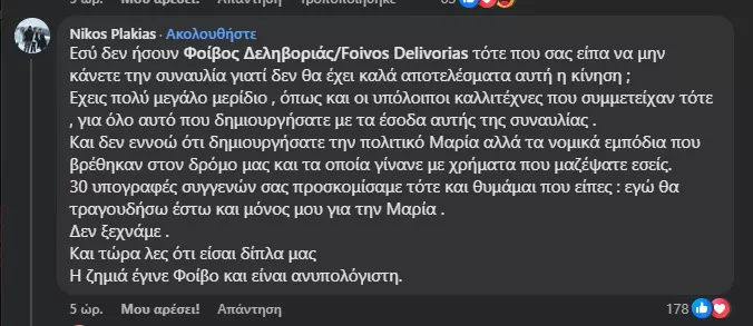 «Εσύ δεν ήσουν, Φοίβο Δεληβοριά τότε που σας είπα να μην κάνετε την συναυλία γιατί δεν θα έχει καλά αποτελέσματα αυτή η κίνηση; Έχεις πολύ μεγάλο μερίδιο , όπως και οι υπόλοιποι καλλιτέχνες που συμμετείχαν τότε , για όλο αυτό που δημιουργήσατε με τα έσοδα αυτής της συναυλίας. Και δεν εννοώ ότι δημιουργήσατε την πολιτικό Μαρία αλλά τα νομικά εμπόδια που βρέθηκαν στον δρόμο μας και τα οποία γίνανε με χρήματα που μαζέψατε εσείς. 30 υπογραφές συγγενών σας προσκομίσαμε τότε και θυμάμαι που είπες : εγώ θα τραγουδήσω έστω και μόνος μου για την Μαρία. Δεν ξεχνάμε . Και τώρα λες ότι είσαι δίπλα μας. Η ζημιά έγινε Φοίβο και είναι ανυπολόγιστη».