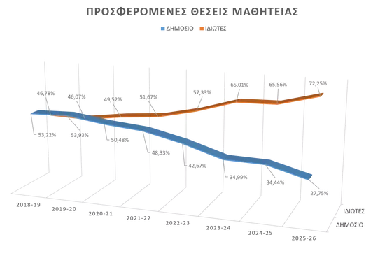 Η συμμετοχή του Ιδιωτικού Τομέα παραμένει ιδιαίτερα υψηλή, καθώς το 72% των θέσεων προέρχεται από επιχειρήσεις, γεγονός που καταδεικνύει την έμπρακτη στήριξή τους στον θεσμό. Αξίζει επίσης να σημειωθεί ότι η προσφορά θέσεων από τον ιδιωτικό τομέα κατέγραψε αύξηση 40% σε σχέση με πέρυσι.