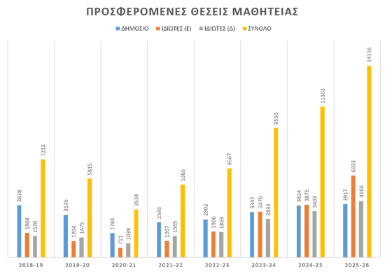 Συγκεκριμένα, 271 φορείς του Δημόσιου Τομέα προσέφεραν 3.917 θέσεις, ενώ από τον Ιδιωτικό Τομέα συμμετείχαν 6.256 επιχειρήσεις, διαθέτοντας συνολικά 10.199 θέσεις μαθητείας. Ο συνολικός αριθμός των διαθέσιμων θέσεων ανέρχεται στις 14.116, σημειώνοντας αύξηση 27% σε σχέση με την περίοδο 2024 -2025.