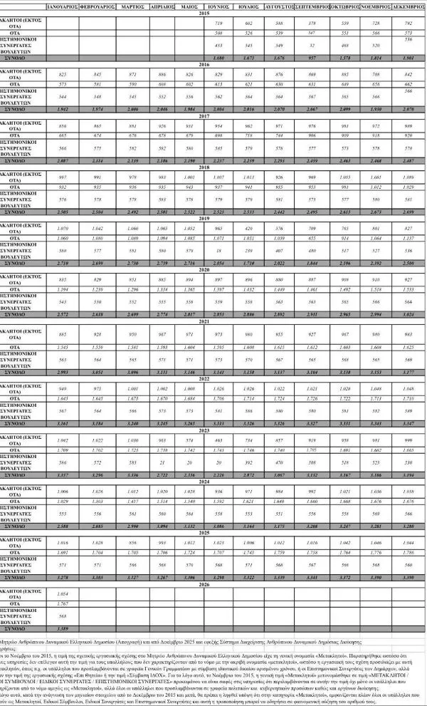 Τον Ιανουάριο του 2026 το σύνολο των μετακλητών υπαλλήλων ήταν 3.389 επιμερισμένοι ως εξής: