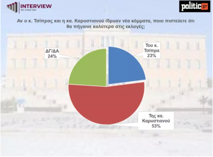 Παράλληλα, οι πολίτες δίνουν σαφή απάντηση στο στο ερώτημα για το ποιο από τα δύο φημολογούμενα κόμματα αυτό του Τσίπρα ή της Καρυστιανού θα πήγαινε καλύτερα στις εκλογές.
