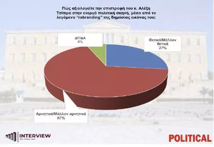 H ίδια δημοσκόπηση αποκαλύπτει ότι μόλις δύο στους δέκα πολίτες θα αγόραζαν το βιβλίο «Ιθάκη» του Αλέξη Τσίπρα, με το οποίο ο πρώην πρωθυπουργός επιχειρεί να «ξανασυστηθεί» στους ψηφοφόρους. Ενώ το ποσοστό ανεβαίνει σε 3 στους 10, όταν ζητείται από τους ερωτώμενους να αξιολογήσουν την επιστροφή του κ. Αλέξη Τσίπρα στην ενεργό πολιτική σκηνή, μέσα από το λεγόμενο «rebranding» της δημόσιας εικόνας του.