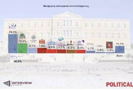 Πρώτη με διαφορά άνω των 14 μονάδων από το ΠΑΣΟΚ (15%) παραμένει η Νέα Δημοκρατία (29,2%) στην εκτίμηση ψήφου στη δημοσκόπηση της Interview για το political.gr, ενώ ο Κυριάκος Μητσοτάκης είναι μακράν ο «καταλληλότερος για πρωθυπουργός».