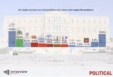 Στην πρόθεση ψήφου, το 24% απαντά ότι θα ψήφιζε τη ΝΔ, το 12% το ΠΑΣΟΚ, το 6,7% την Ελληνική Λύση, το 6,5% το ΚΚΕ, το 5,2% τη Φωνή Λογικής, το 4,6% την Πλεύση Ελευθερίας, το 4% το ΜέΡΑ25, το Κίνημα Δημοκρατίας το 4%, τον ΣΥΡΙΖΑ το 3%, τη Νίκη το 1,3%, τη Νέα Αριστερά το 1,1%, το 8% άλλο, ενώ σημαντικό και συγκεκριμένα 19,6% είναι το ποσοστό των πολιτών που δηλώνουν ότι δεν έχουν αποφασίσει.