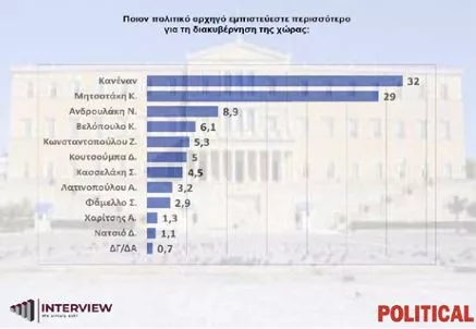 Σταθερή πρωτιά στην ερώτηση «ποιον πολιτικό εμπιστεύεστε πιο πολύ για τη διακυβέρνηση της χώρας;» διατηρεί ο πρωθυπουργός Κυριάκος Μητσοτάκης, με ποσοστό 29%. Στην πρώτη θέση παραμένει ο «Κανένας» με ποσοστό 32%, και ακολουθούν ο Νίκος Ανδρουλάκης με 8,9%, ο Κυριάκος Βελόπουλος με 6,1%, η Ζωή Κωνσταντοπούλου με 5,3%, ο Δημήτρης Κουτσούμπας με 5%, ο Στέφανος Κασσελάκης με 4,5%, η Αφροδίτη Λατινοπούλου με 3,2%, ο Σωκράτης Φάμελλος με 2,9%, ο Αλέξης Χαρίτσης με 1,3%, ο Δημήτρης Νατσιός με 1,1% και 0,7% απαντούν ΔΞ/ΔΑ.