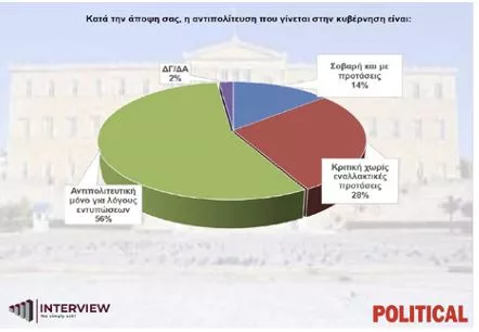 Όπως δείχνει η επόμενη ερώτηση, ωστόσο, μόλις το 14% εκ των ερωτηθέντων θεωρεί ότι γίνεται σοβαρή αντιπολίτευση και με προτάσεις προς την κυβέρνηση. Αντιθέτως, το 56% θεωρεί ότι γίνεται αντιπολίτευση μόνο για λόγους εντυπώσεων, το 28% εκτιμά ότι γίνεται αντιπολίτευση χωρίς εναλλακτικές προτάσεις και το 2% απαντά ΔΞ/ΔΑ.