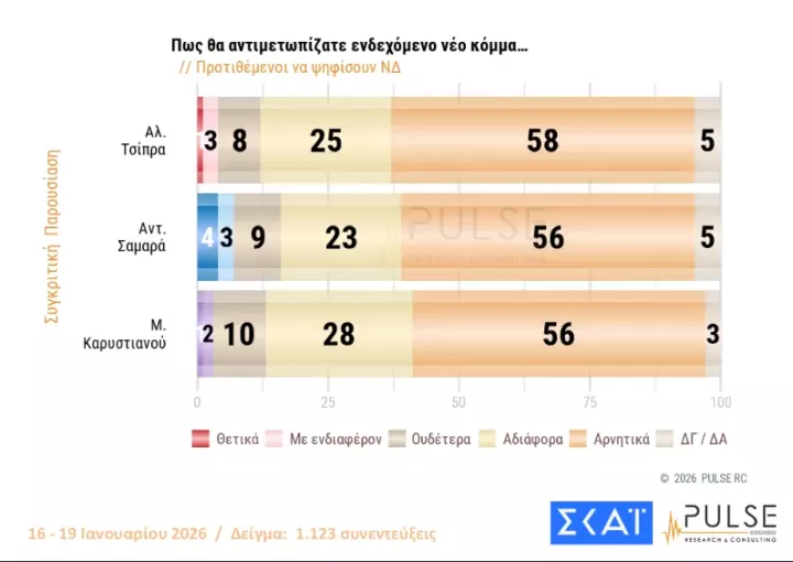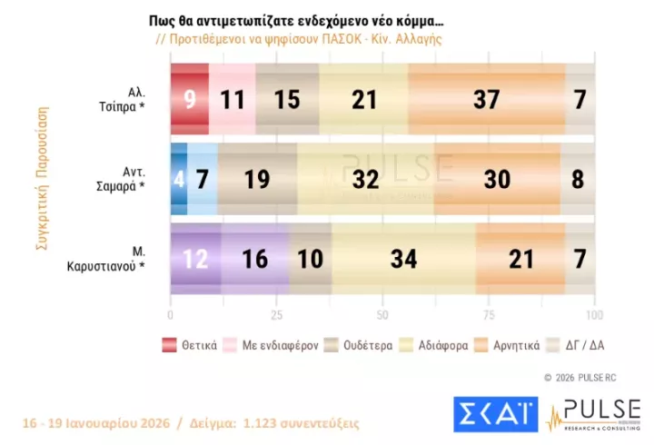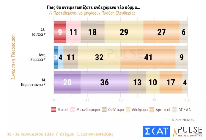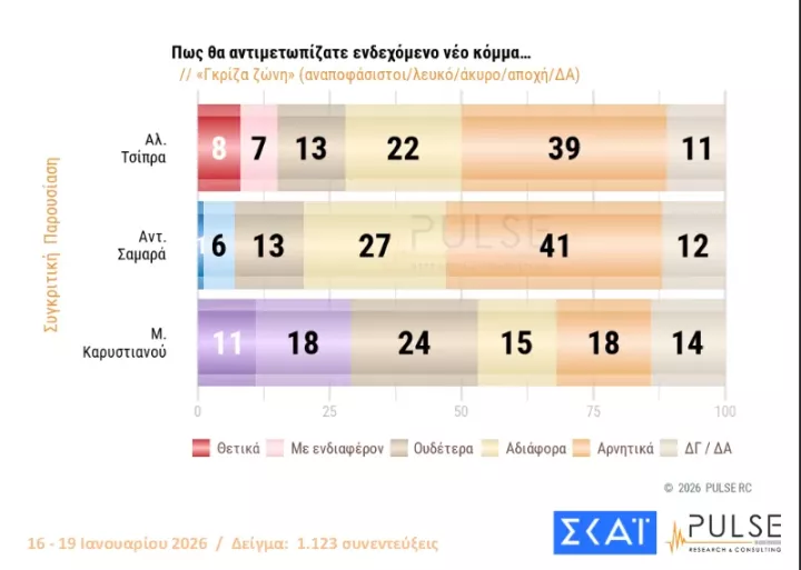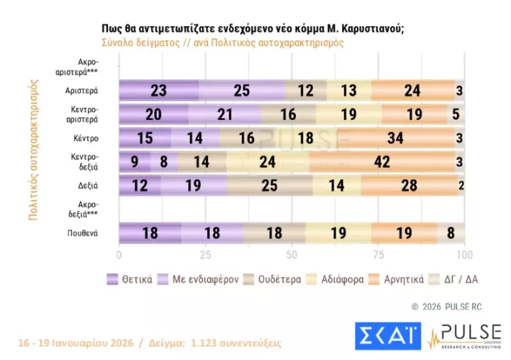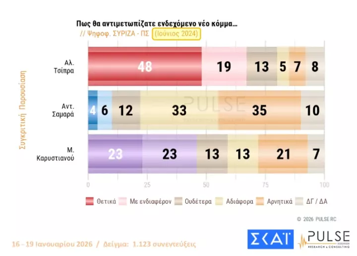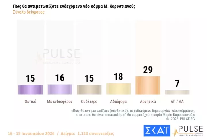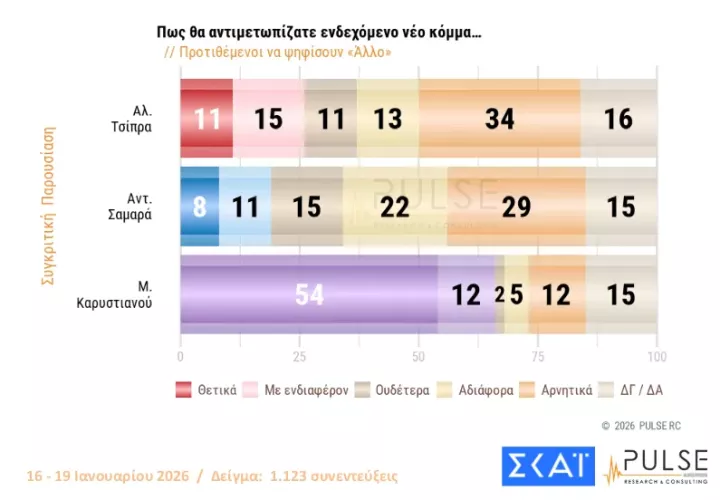 Η αποδοχή που τυγχάνει το «κόμμα» Καρυστιανού ανέρχεται στο 31% (θετικά και με ενδιαφέρον), ενώ του Αλέξη Τσίπρα είναι στο 19% και του Αντώνη Σαμαρά στο 10%.