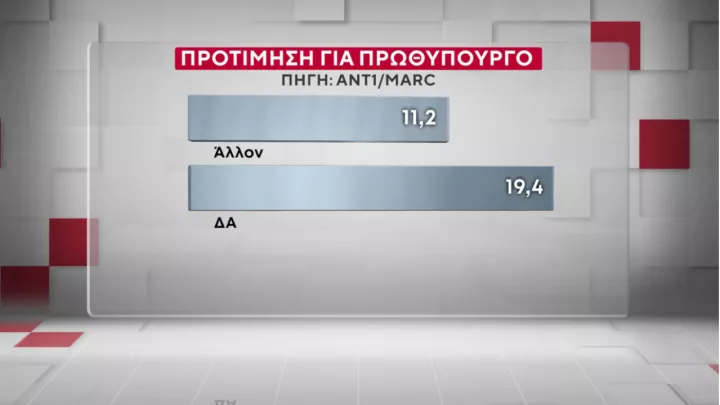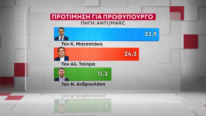 Παράλληλα, η Marc για πρώτη φορά συμπεριέλαβε τον Αλέξη Τσίπρα σε ερώτημα για τον καταλληλότερο πρωθυπουργό. Ο πρώην πρωθυπουργός λαμβάνει 24,3%, δηλαδή 9,6 μονάδες χαμηλότερα από τον Κυριάκο Μητσοτάκη, ο οποίος λαμβάνει 33,9%, με τον Νίκο Ανδρουλάκη τρίτο στο 11,3%.